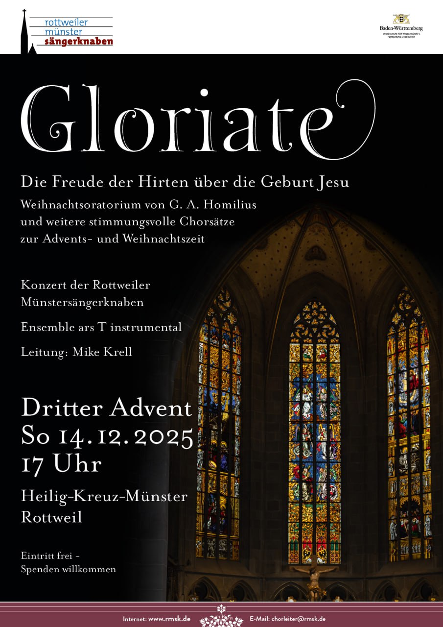 Die Rottweiler Münstersängerknaben unter der Leitung von Mike Krell, haben unter dem Titel „Gloriate – Die Freude der Hirten über die Geburt Jesu“ wieder ein stimmungsvolles Programm für das traditionelle Weihnachtskonzert am 3. Advent zusammengestellt. Im Rottweiler Münster wird der Konzertchor das Weihnachtsoratorium von G. A. Homilius, sowie stimmungsvolle Chorsätze zur Advents- und Weihnachtszeit aufführen.